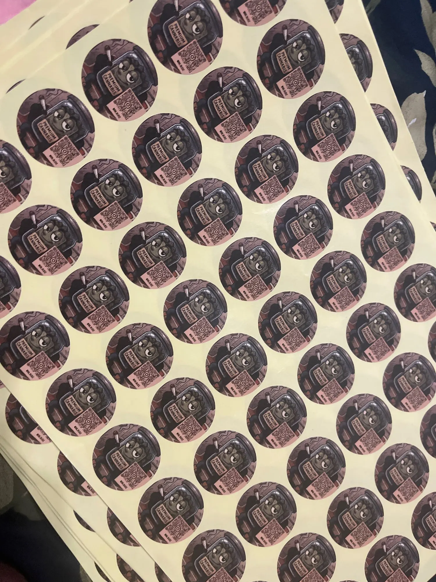 Custom stickers available in 3.5 cm, 4.5 cm, and 6 cm size options
