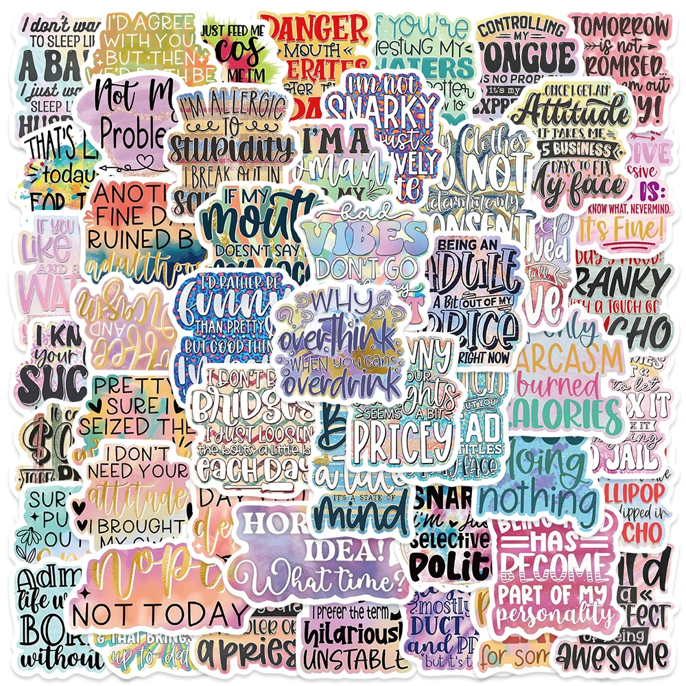 Colorful sarcasm quote stickers featuring humorous phrases and vibrant fonts