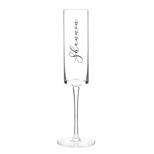 Personalized wedding champagne flute custom laser engraved with a name. Elegant toasting glass, perfect for weddings, anniversaries, and thoughtful couple gifts.