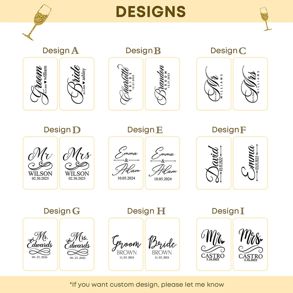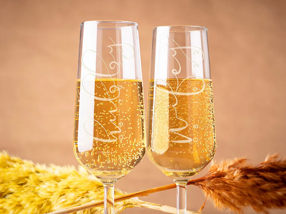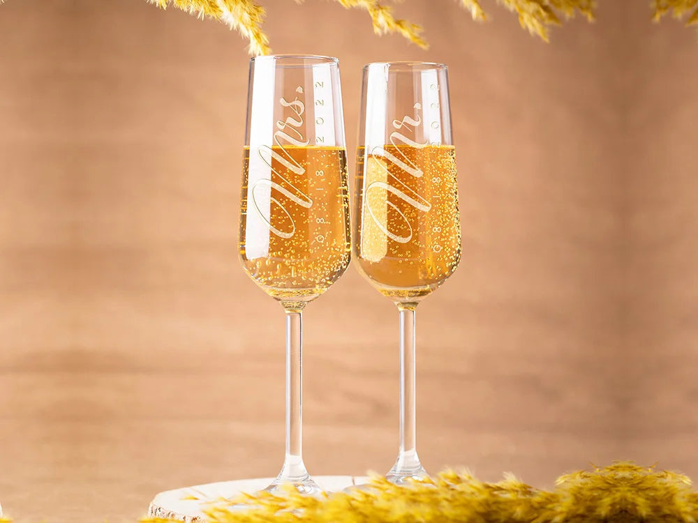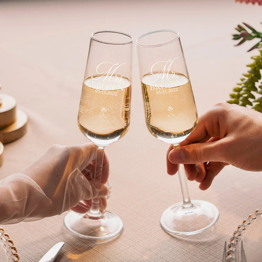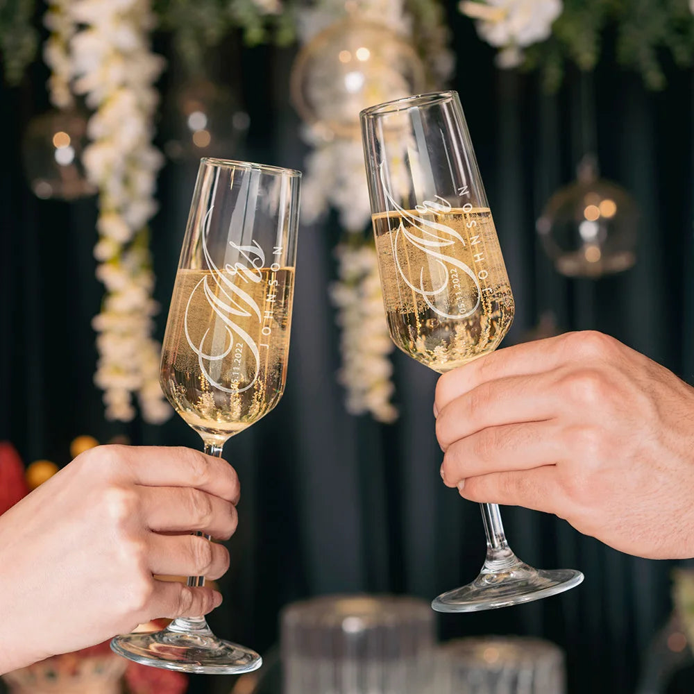 Engraved Mr & Mrs Champagne Flutes crafted from high-quality glass, designed as a timeless wedding accessory for the bride and groom. These elegant flutes are personalized with precision engraving, allowing you to add a title, names, and a special date to commemorate your celebration.